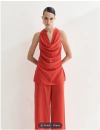 O grande destaque é o decote drapeado (cowl neck) que confere movimento e valoriza o colo de forma sutil, garantindo um apelo chic instantâneo. A cava americana e o fechamento posterior por zíper invisível arrematam o design, resultando em um visual limpo e moderno. Combine-a com a nossa Pantalona Vermelha para um look monocromático de alto impacto ou use-a com peças neutras para um look de trabalho elegante ou um evento de coquetel.