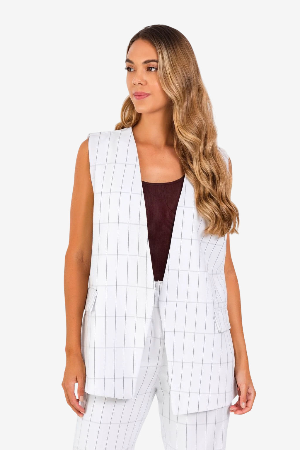 Descubra a sofisticação em cada detalhe com nosso conjunto de alfaiataria feminina composto por colete alongado sem mangas e calça pantalona de cintura alta na clássica estampa risca de giz branca com xadrez preto. Desenvolvido em tecido premium de alfaiataria, esse look une conforto, caimento perfeito e acabamento impecável, ideal para mulheres que buscam presença e estilo em qualquer ocasião.